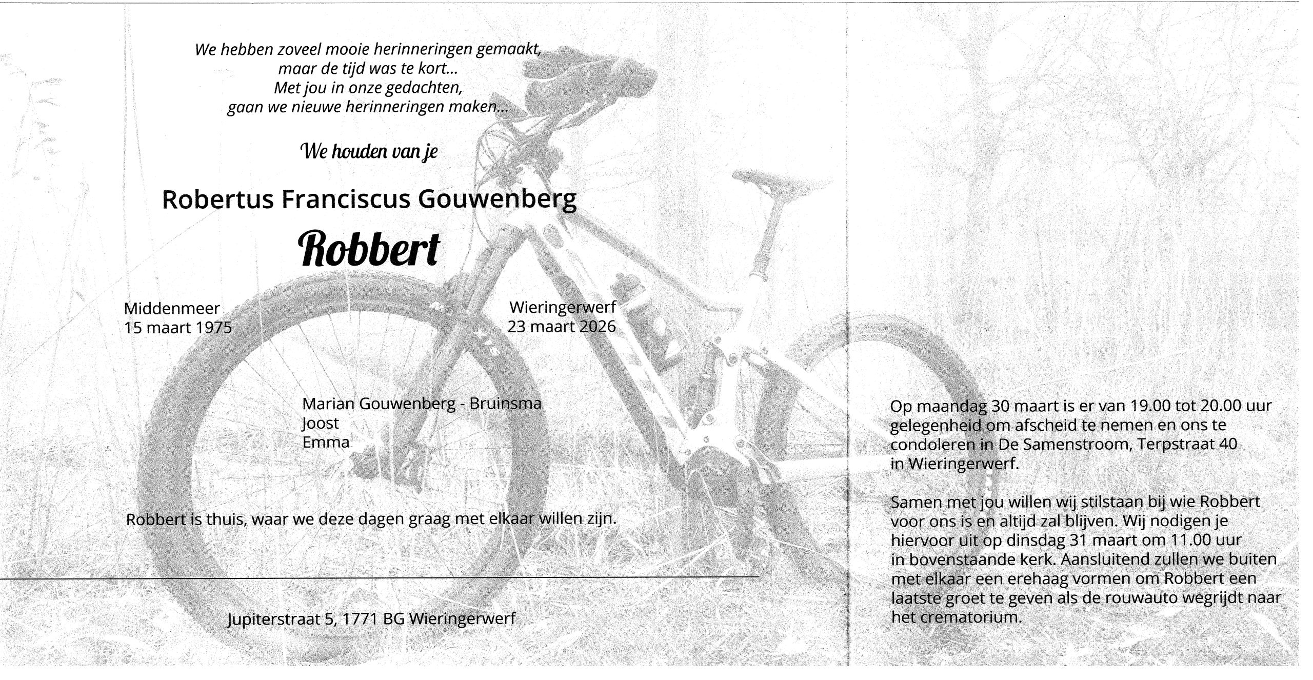 Op 23 maart is op 51 jarige leeftijd overleden Robbert Gouwenberg.