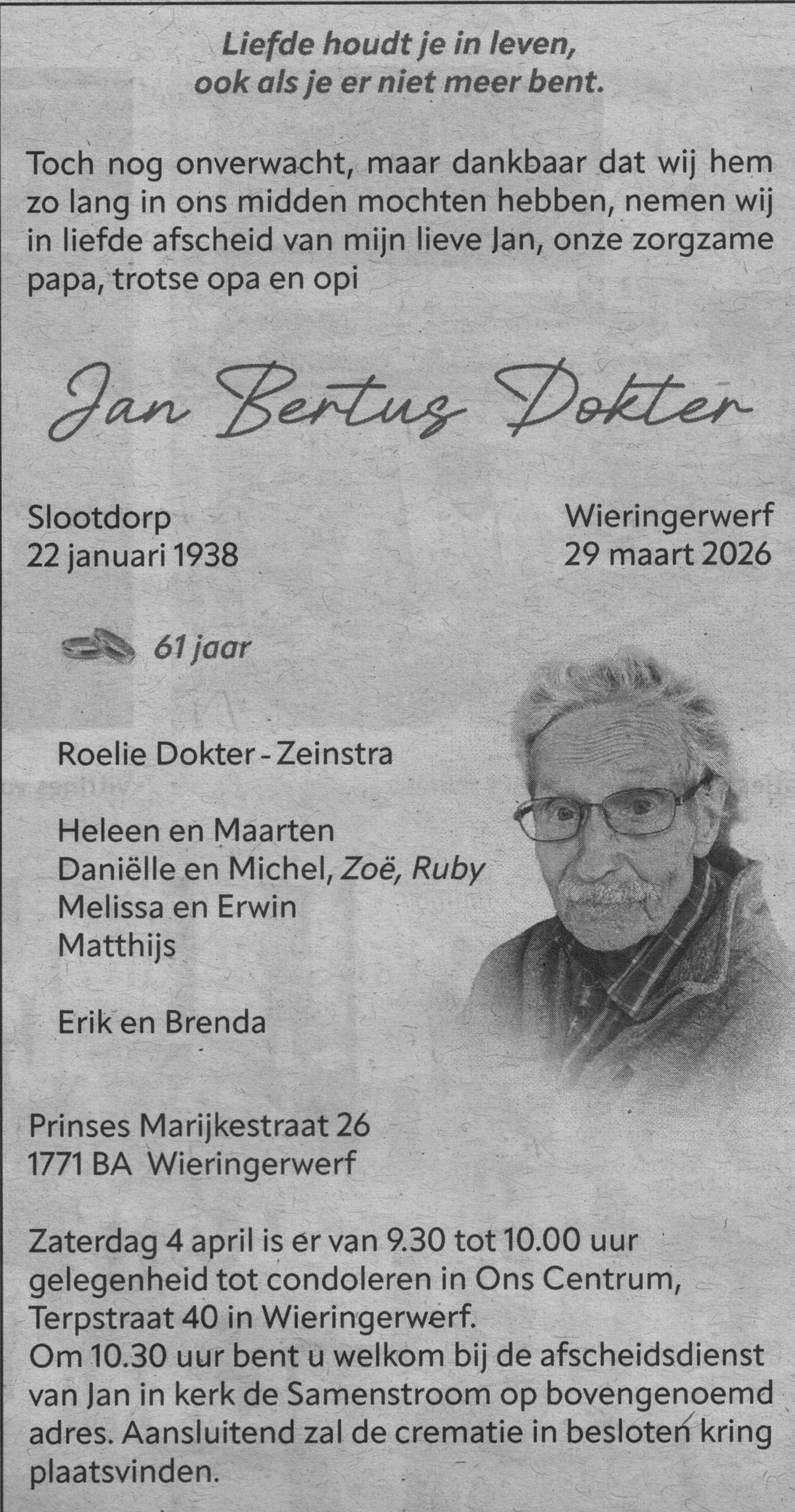 Gelegenheid om afscheid te nemen en te condoleren op maandag 30 maart van 19.00 tot 20.00 uur in de Samenstroom te Wieringerwerf.